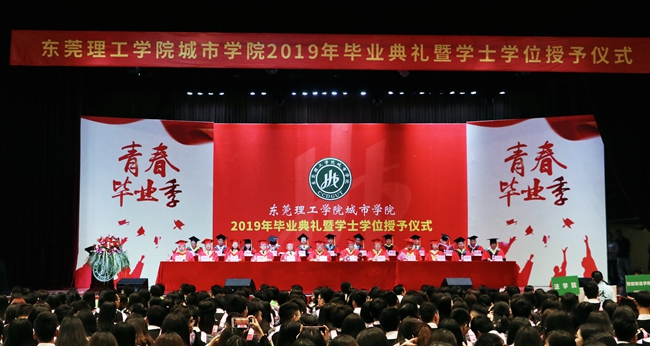6月21日,beat365官网在综合馆隆重举行2019年毕业典礼暨学士学位授予仪式。 在主席台前排就座的领导有:东莞理工学院党委副书记、城市学院董事吕琦元,广东鸿发投资集团有限公司副总裁、城市学院董事黎建烨,广东鸿发教育文化集