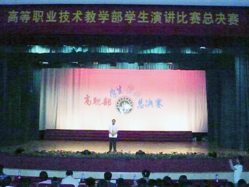 6月2日,高职部在大礼堂举行了首届学生演讲比赛。 参赛的选手都是预赛中选拔出来的优秀选手,演讲的内容涵盖奥运、学风和抗震救灾等多个方面。选手们从容自信、声情并茂的演讲,深深感动了在场的每一位师生,也赢得了阵阵掌声。