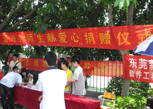 5月14日,管理系在食堂门口举行“抗震救灾,你我有责”献爱心捐赠活动。系主任罗余才教授、系党总支书记徐中和教授率先示范,分别捐款一千元和五百元。教师们纷纷响应,慷慨解囊,各尽其力。06物流2班的全体同学得知地震发生之后,