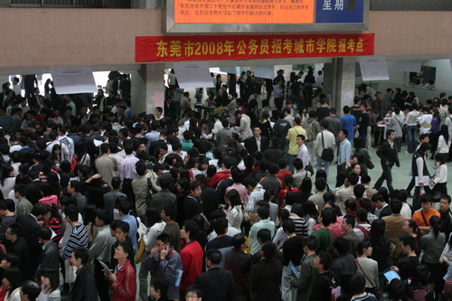 3月13—14日,东莞市2008年公务员招考今日在我院接受报名。这天一大早,学院4号楼大厅挤满了来自四面八方的考生,处处排起了长龙。 据悉,今年东莞共招录公务员887人,其中招录机关公务员437人,人民警察450人。招录最多的单位是东莞市