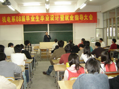 3月4日,机电工程系在机电楼工厂二召开08届毕业生毕业设计暨就业指导大会。机电系主任黄健求、系总支副书记谢明副教授以及毕业生各专业指导老师参加了会议。 学院就业指导办主任江小卫老师给毕业生作就业指导报告,向同学们详细分