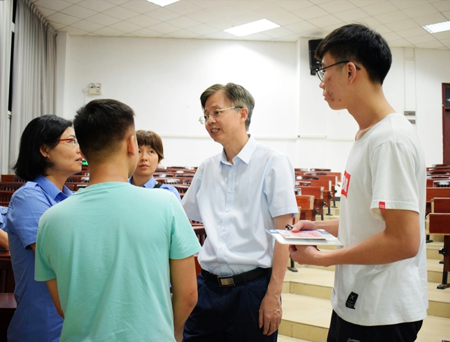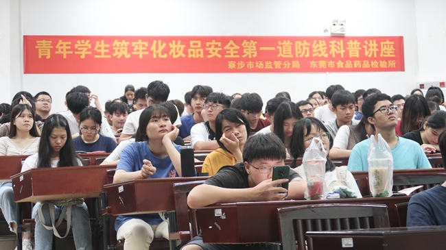 5月21日晚,由东莞市市场监督管理局寮步分局主办的青年学生筑牢化妆品安全第一道防线科普讲座,在教学楼7B202。寮步市场监管分局副局长尹家付、东莞市人民医院皮肤科主任李俊杰和beat365官网办公室杜鹏举主任和后勤保卫处王锦锋处长聆听了讲座。
