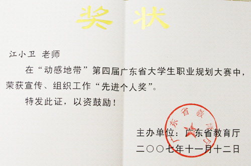 据悉,由广东省教育厅主办的职业规划大赛于今年5月10日正式启动,大赛主题是:规划精彩人生,打造锦绣前程。我院共有2086人参赛,并以1039份作品在全省100多所高校中位居第四名。