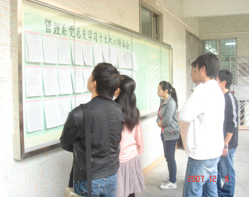 为了深入宣传贯彻十七大精神,管理系党总支将15名教师党员和17名学生党员学习十七大文件的心得体会,在系宣传栏里展出,供全系党员学习交流。
