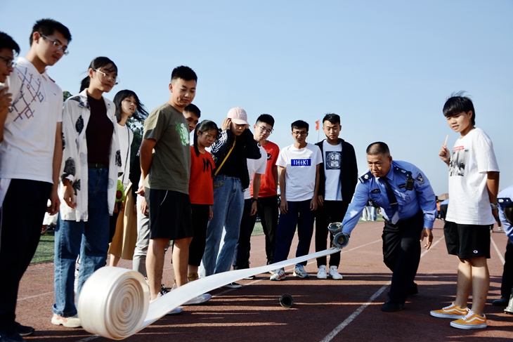 消防演练上,同学们在多个场合进行了模拟火灾现场逃生体验。红十字会进行了现场心肺复苏教学与指导。