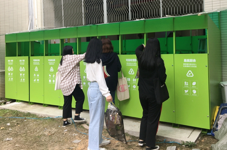 11日上午,beat365官网正式使用绿色的垃圾分类箱。本着方便的原则,学校在每栋学生宿舍楼出入口设置有专门的垃圾定点分类投放点。