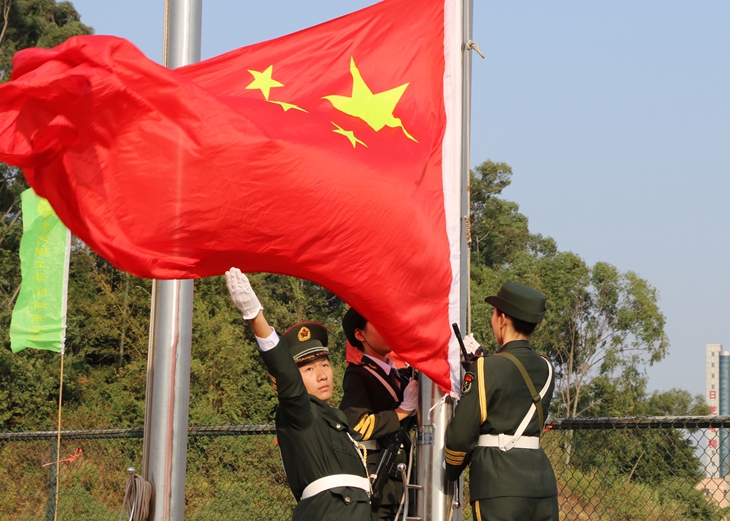 在庄严的国歌声中,五星红旗在田径场上空冉冉升起。