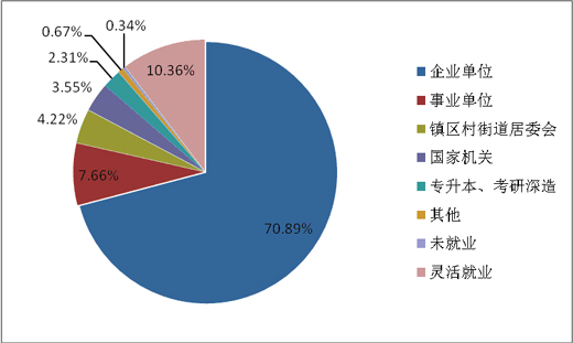 07届毕业生的就业去向统计数据中,有七成在企业,其中私营企业占30.01%,民营企业占20.21%,国有企业占14.58%;另外有10.36%的毕业生选择了灵活就业;7.7%的毕业生选择了事业单位;在国家机关就业的占3.55%;镇区村及街道居委会就业的占4.22%;专升本、考研深造的占2.31%。