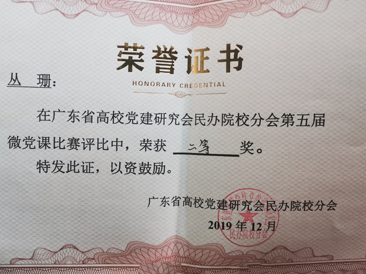 12月9日,广东省高校党建研究会民办院校分会2019年第五届微党课比赛(决赛)在广东岭南职业技术学院科技中心举行,法学院丛珊老师代表beat365官网参加决赛并荣获二等奖。