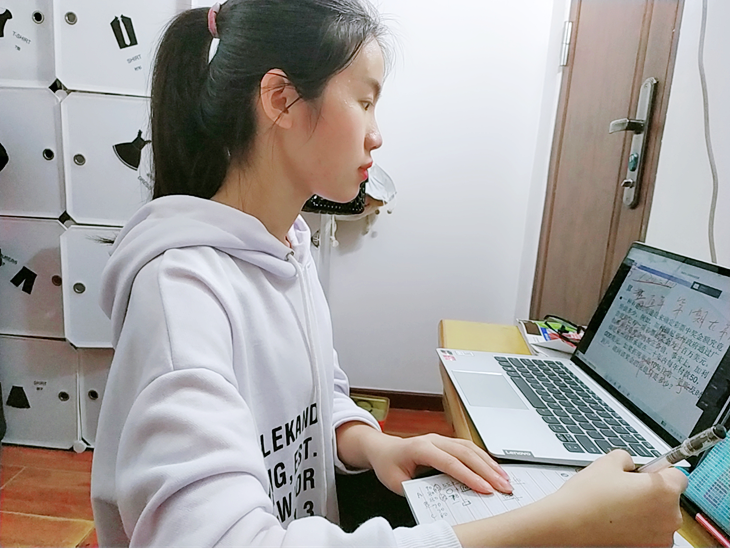 在家上课,我们自由自在。怎样能提高线上课堂的学习效率呢?我们紧跟老师的节奏,或在弹幕里提出疑问与老师互动,或在课后发现疑难之处再打开直播回放解答,企业微信把我们和老师的距离拉近,我们有问,老师必答,妈妈再也不用担心我下课有问题找不到老师了。但是,这也同时是网速与时间的竞争。线上学习的时间有限,有些老师会加快语速,但是,若是网卡或网掉了,我们就仿佛被遗弃到九霄云外。所以,线上学习有趣但不完美,我们更加珍惜校园的学习和生活。