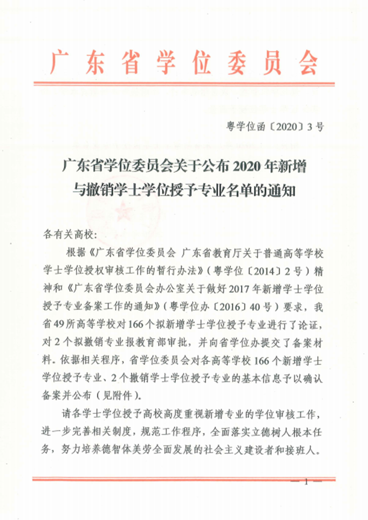 其中,根据广东省学位委员会关于公布2020年新增与撤销学士学位授予专业名单的通知,beat365官网2020年新增5个学士学位授予专业名单,分别为工程管理、视觉传达设计、网络与新媒体、电子商务、音乐表演。至此,beat365官网经教育部批准(备案)的专业共44个,具有学士学位授予权的专业共34个。今年新获得学士学位授予权的专业将从2020届毕业生开始授予学位。