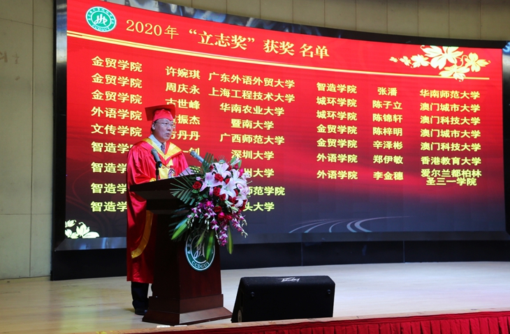 学校党委书记章德胜宣读了《关于表彰2020届优秀毕业生的决定》及《关于授予张汝茵等34名毕业生“立志奖”的决定(第一批)》,授予梁金凤等269名同学“2020届优秀毕业生”荣誉称号,对第一批张汝茵等34名成功考取研究生的同学授予东莞理工学院城市学院 “立志奖”。