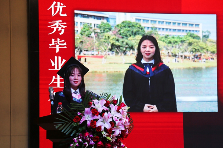 优秀毕业生代表、商学院16级物流管理2班卓佳雪同学在发言中表示,非常感谢学校举办这一场特别的毕业典礼。她回顾了大学生活的点点滴滴,感恩母校师长的教诲、同学的情谊,让自己懂得了一路坚持,有了现在的成长。