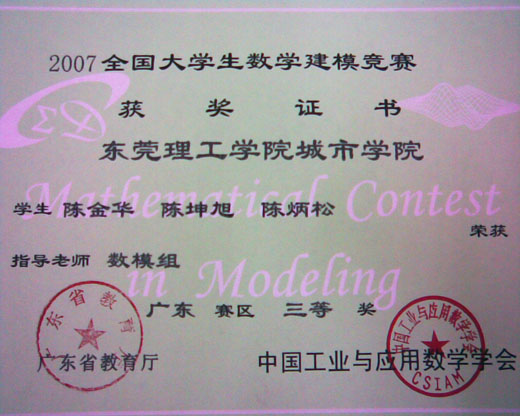 近日,广东省教育厅发文公布2007年全国大学生数学建模竞赛广东赛区获奖名单。据悉,全省共有49所高校、581支队伍参加了广东赛区的比赛,来自我院的10支代表队、30名同学参加了比赛。其中廉玉忠教授指导的计算机与信息科学系代表队(陈金华、陈坤旭、陈炳松同学组成)荣获省三等奖,其余9组获成功参赛奖。