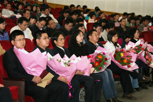 会议首先举行2007年度学院“十大工作创新奖”及2007年度“校园教工十佳”颁奖仪式。学术副院长程发良教授、党委副书记朱冰同志分别宣读学院的表彰决定,院领导分别为获奖项目、获奖者颁发了荣誉证书和奖金。获奖者手捧鲜花与奖状,接受全体教职工的祝贺。