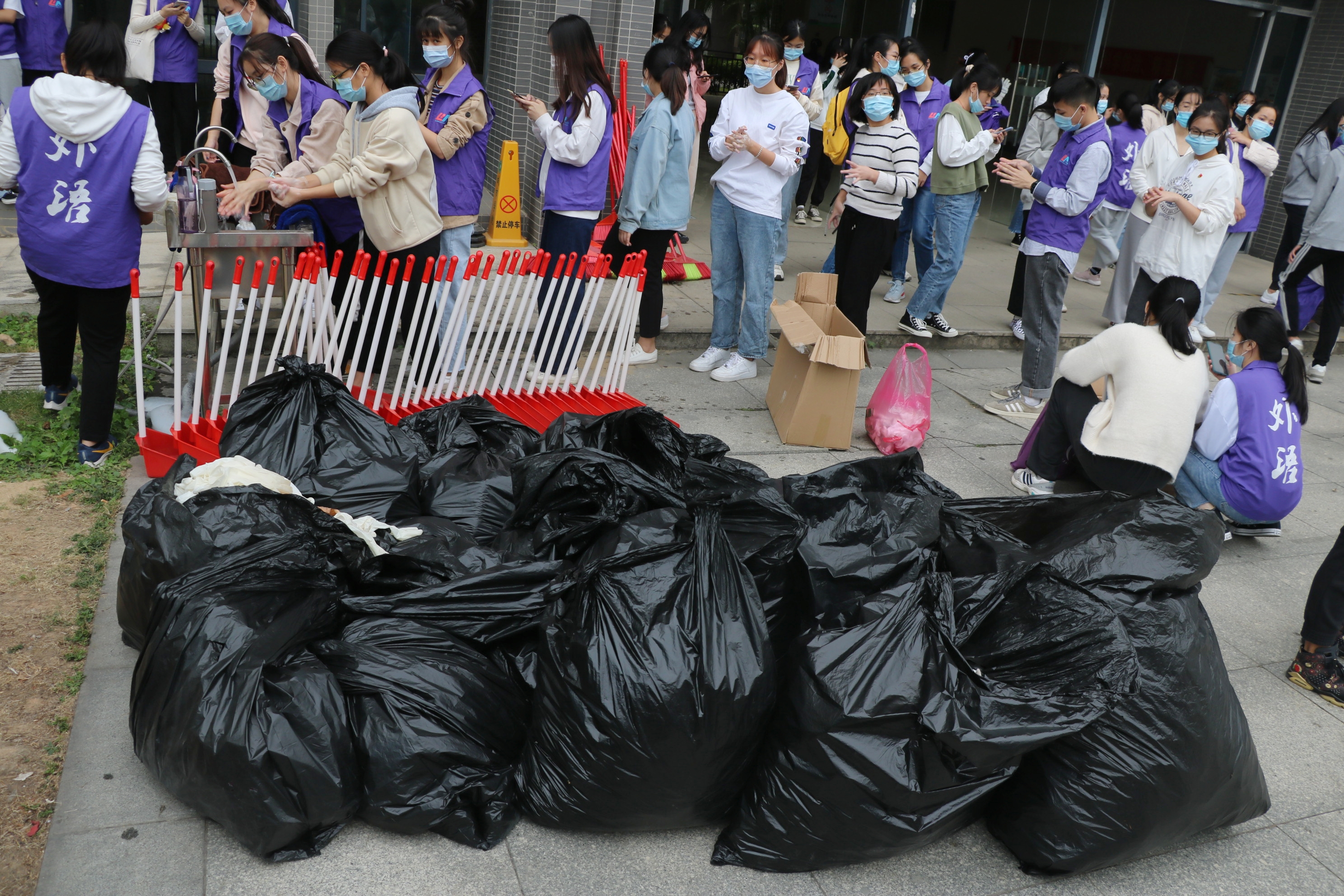 活动前期,外国语学院学生党支部积极筹划,按时进行活动申报、备好物资、安排部署动员工作,以保证本次主题党日活动的顺利开展。活动中,参与者分17组对教学楼7A、7B、7C共205间课室进行清洁。他们身穿紫色马甲,佩戴口罩和手套,手提垃圾袋,依次对教室门窗、桌椅、走道等各个角落中遗留的饭盒、纸张、饮料瓶等垃圾进行清理并分类回收。他们不怕脏、不怕苦、不怕累,不放过任何垃圾;他们积极投身于课室、楼宇的文明卫生清扫工作,凝聚起共同建设美丽校园的强大合力,致力于为大家营造了一个清新怡人、干净整洁的校园学习环境。