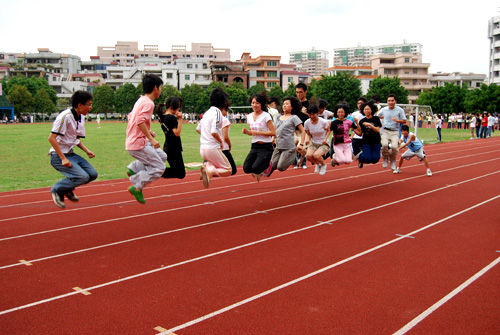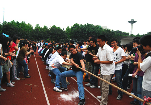 传统项目拔河历久弥新,“团结力量大”这句话在这个项目上得到了最好的体现。不过,最吸引同学们眼球的莫过于趣味运动会,它包括过圈、双人跳绳接力、接力运球、齐心搬垫、同心协力,这些项目虽然运动强度不大,却在很大程度上考验着同学们的团体协作意识和身体协调性。