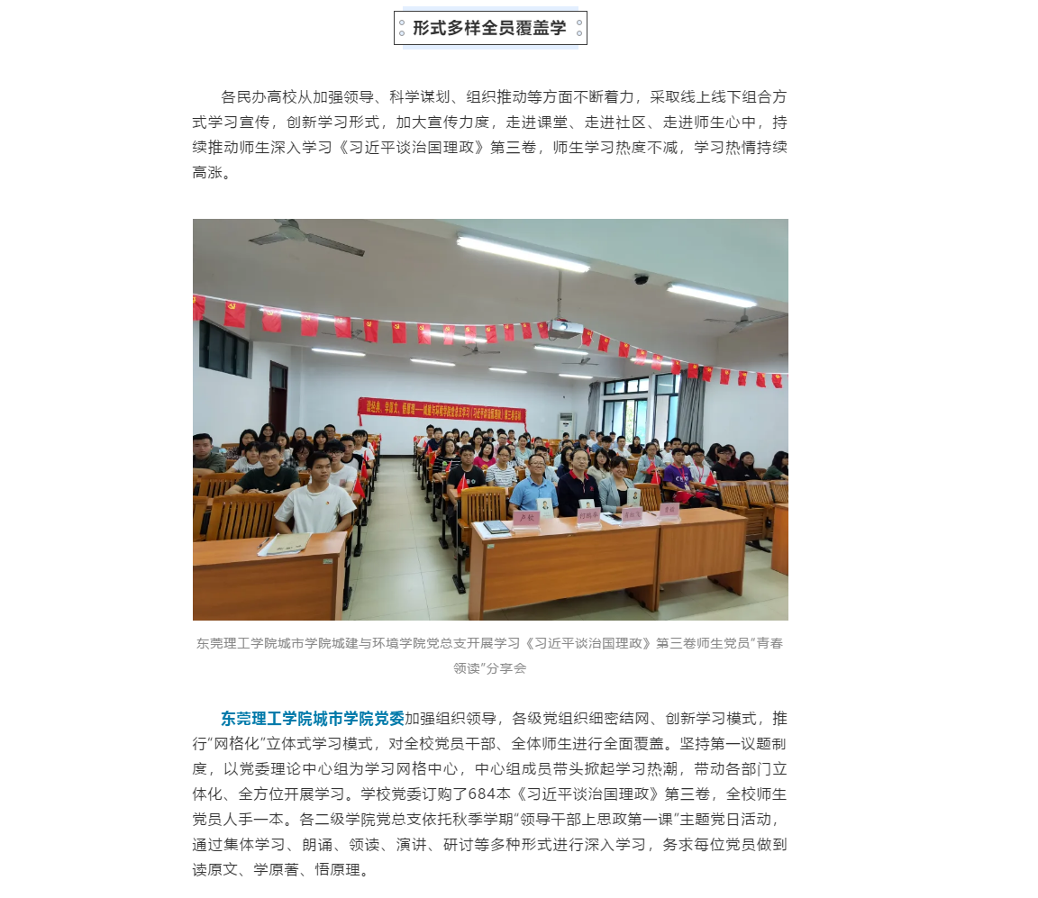 beat365官网党委加强组织领导,各级党组织细密结网、创新学习模式,推行“网格化”立体式学习模式,对全校党员干部、全体师生进行全面覆盖。坚持第一议题制度,以党委理论中心组为学习网格中心,中心组成员带头掀起学习热潮,带动各部门立体化、全方位开展学习。学校党委订购了684本《习近平谈治国理政》第三卷,全校师生党员人手一本。各二级学院党总支依托秋季学期“领导干部上思政第一课”、主题党日活动,通过集体学习、朗诵、领读、演讲、研讨等多种形式进行深入学习,务求每位党员做到读原文、学原著、悟原理。