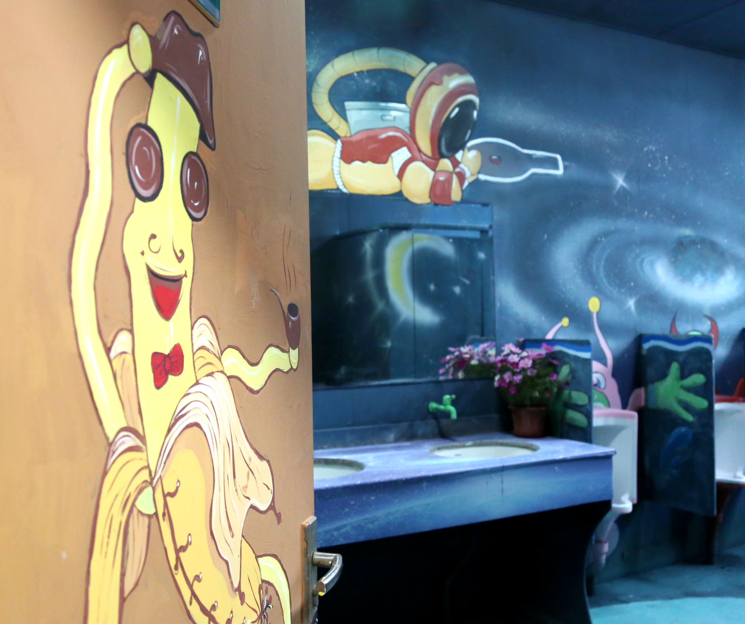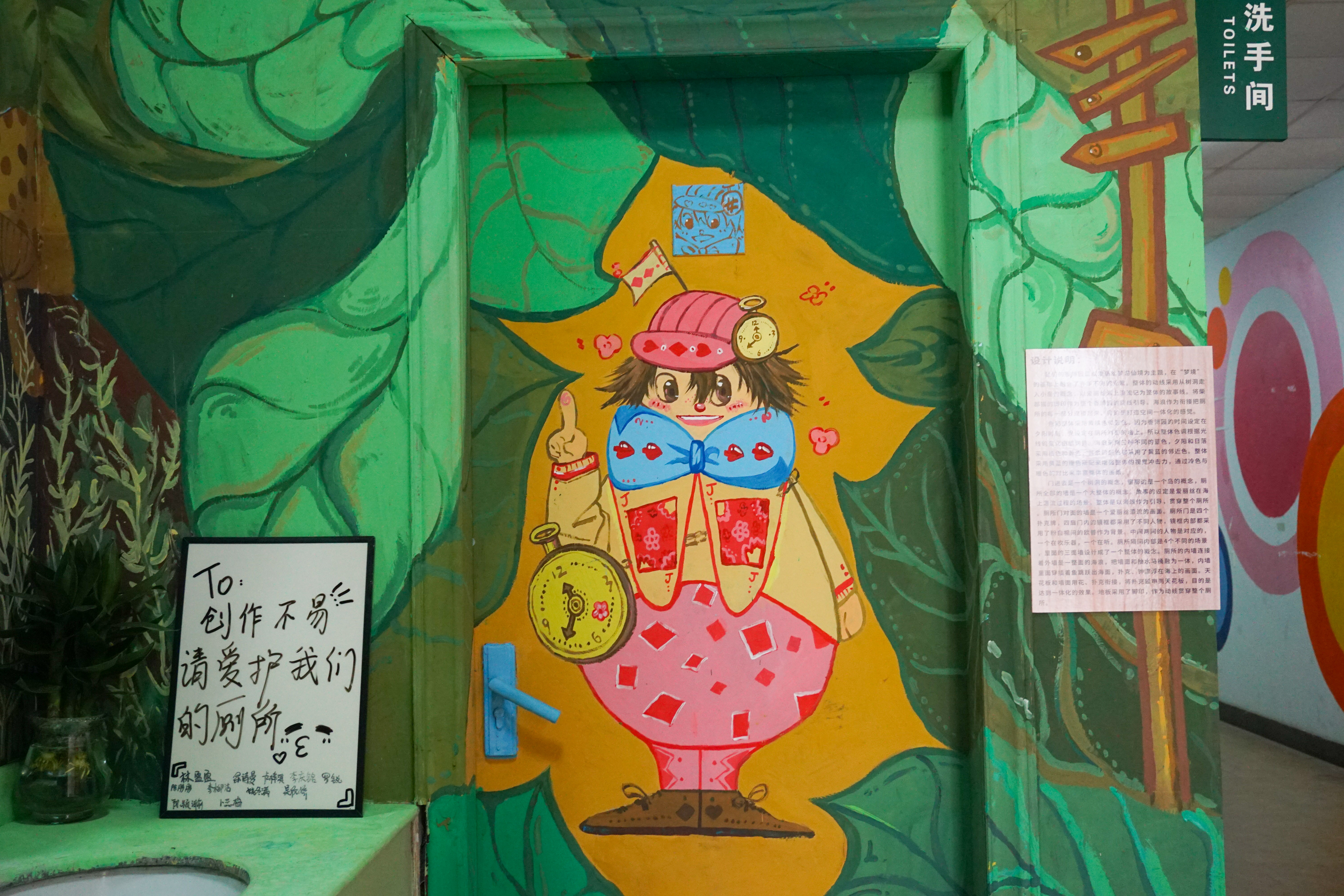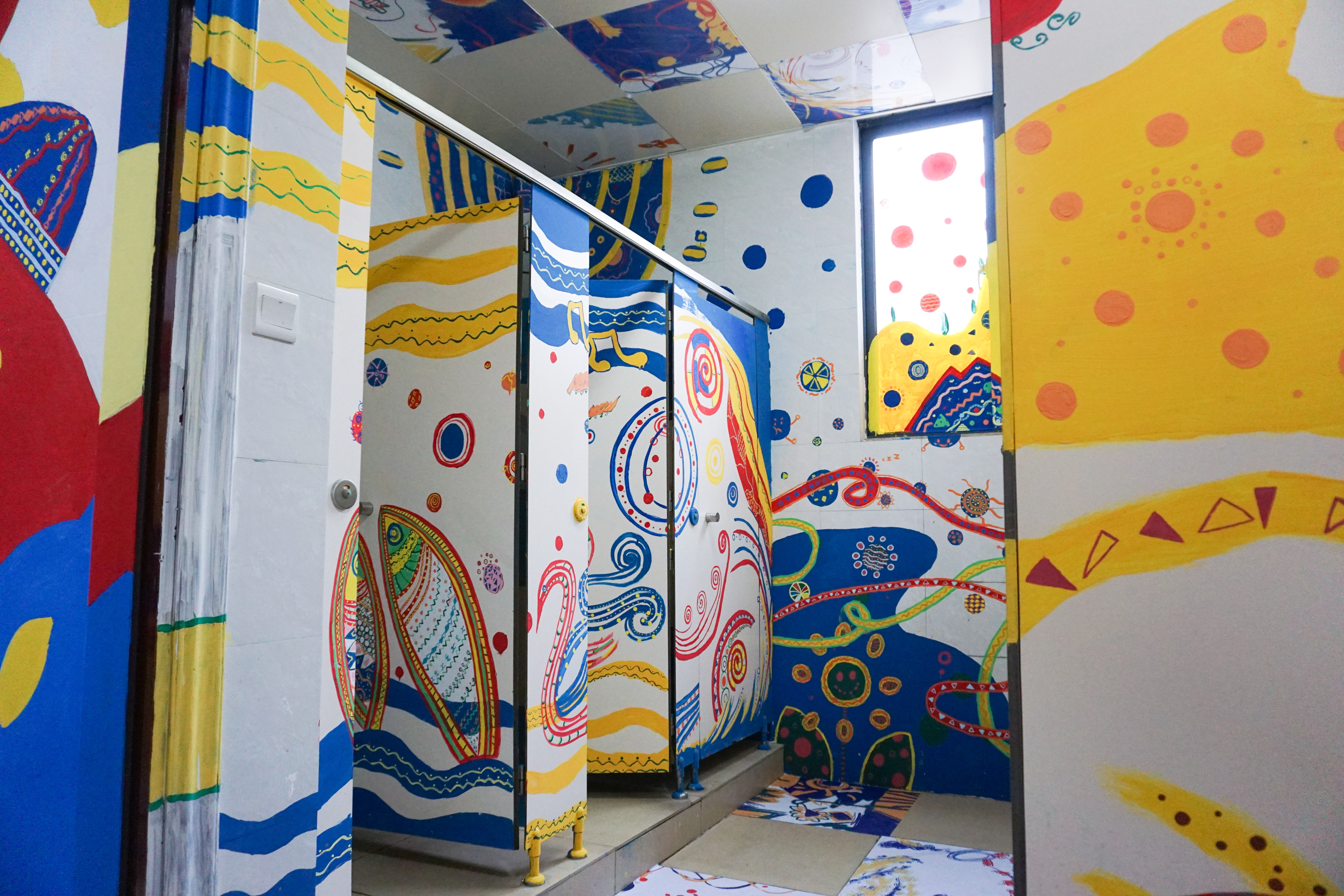 本次装置艺术以beat365官网卫生间为设计基础,创意设计学院副院长林右正教授带领2019级视觉传达设计专业3班同学,分为4个主题:《爱丽丝梦游仙境》(一)(二)、《宇宙星空》以及《撞色》,运用色彩的碰撞,与点线面的结合,绘制出4种不同风格的厕所装置设计,内容丰富有趣、题材创新多样,从色彩、表现内容、情节等,透过想象,以手绘及拼贴等多元应用方式表现,形成独具特色的卫生间装置艺术作品。
