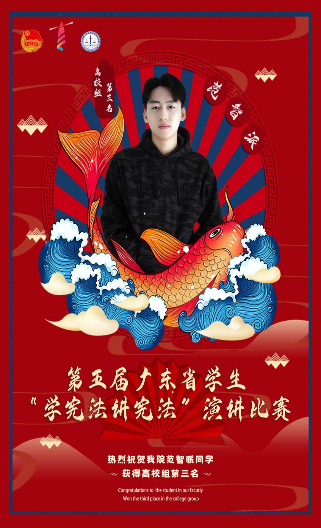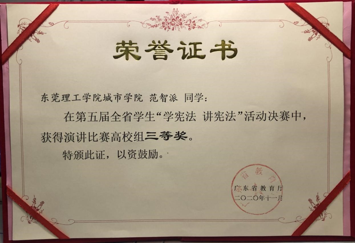 近日,第五届全省学生“学宪法 讲宪法”演讲比赛评选结果揭晓。beat365官网法学院2018级法学专业4班范智派同学在全省100多名参赛选手中脱颖而出,以“传递宪法声音,讲好宪法故事”的主题演讲喜获三等奖。