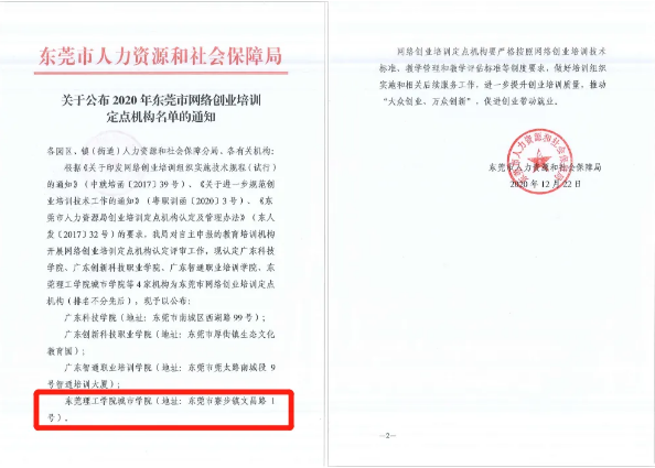 近日,东莞市人力资源和社会保障局发文公布“2020年东莞市网络创业培训定点机构名单,根据《关于印发网络创业培训组织实施技术规程(试行)的通知》、《关于进一步规划创业培训技术工作的通知》、《东莞市人力资源局创业培训定点机构认定及管理办法》的要求,经镇街(园区)推荐、形式审查、专家现场考察,东莞理工学院城市学院被认定为东莞市网络创业培训定点机构。