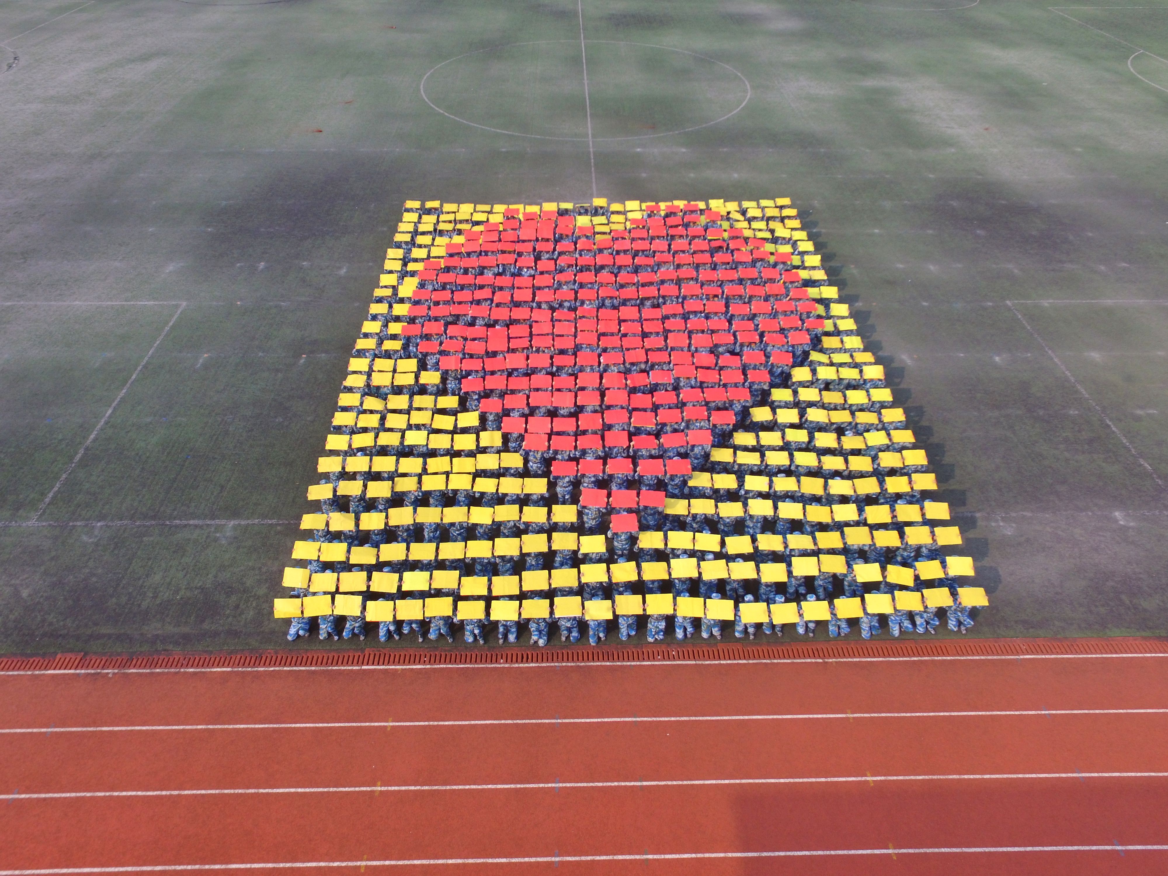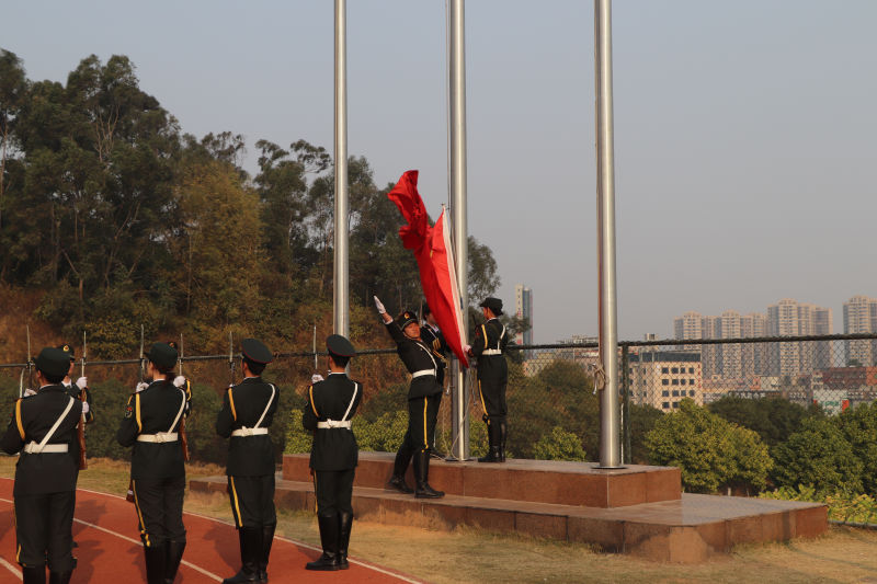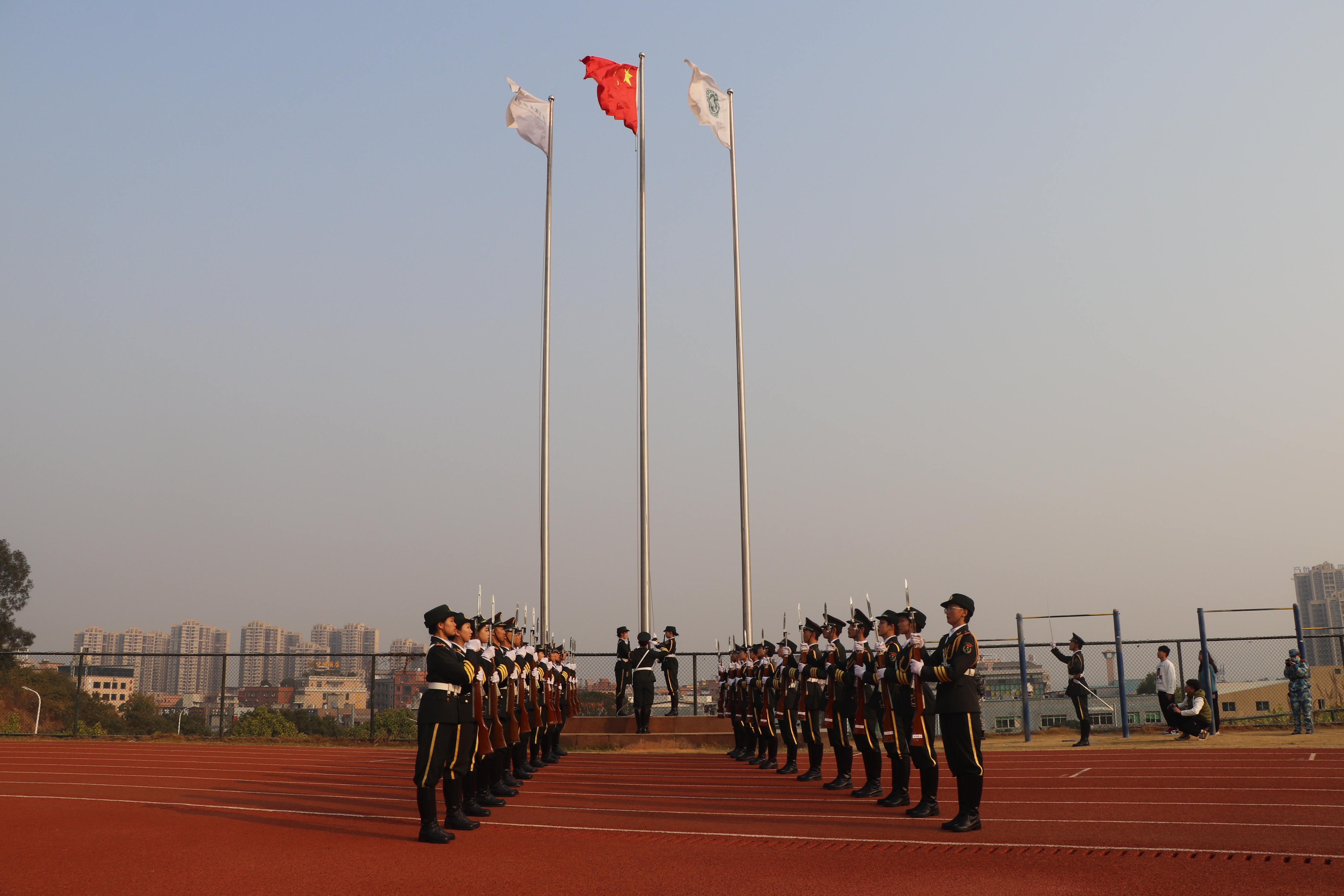 国旗护卫队踏着整齐有力的步伐进入展示场地,护送着鲜红的五星红旗入场并升起国旗,全体师生随即奏唱国歌。