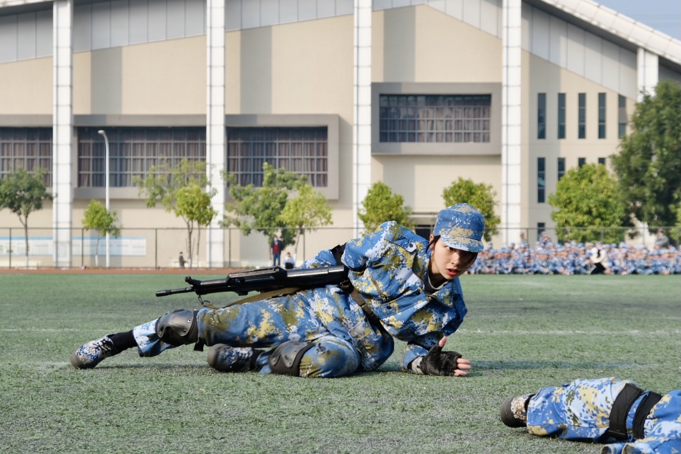 单兵战术基本操作环节,通过持枪、屈伸前进、匍匐前进、滚进,冲击敌兵成功炸毁敌碉堡,展现了2020年大一新生敢冲敢闯的气势。