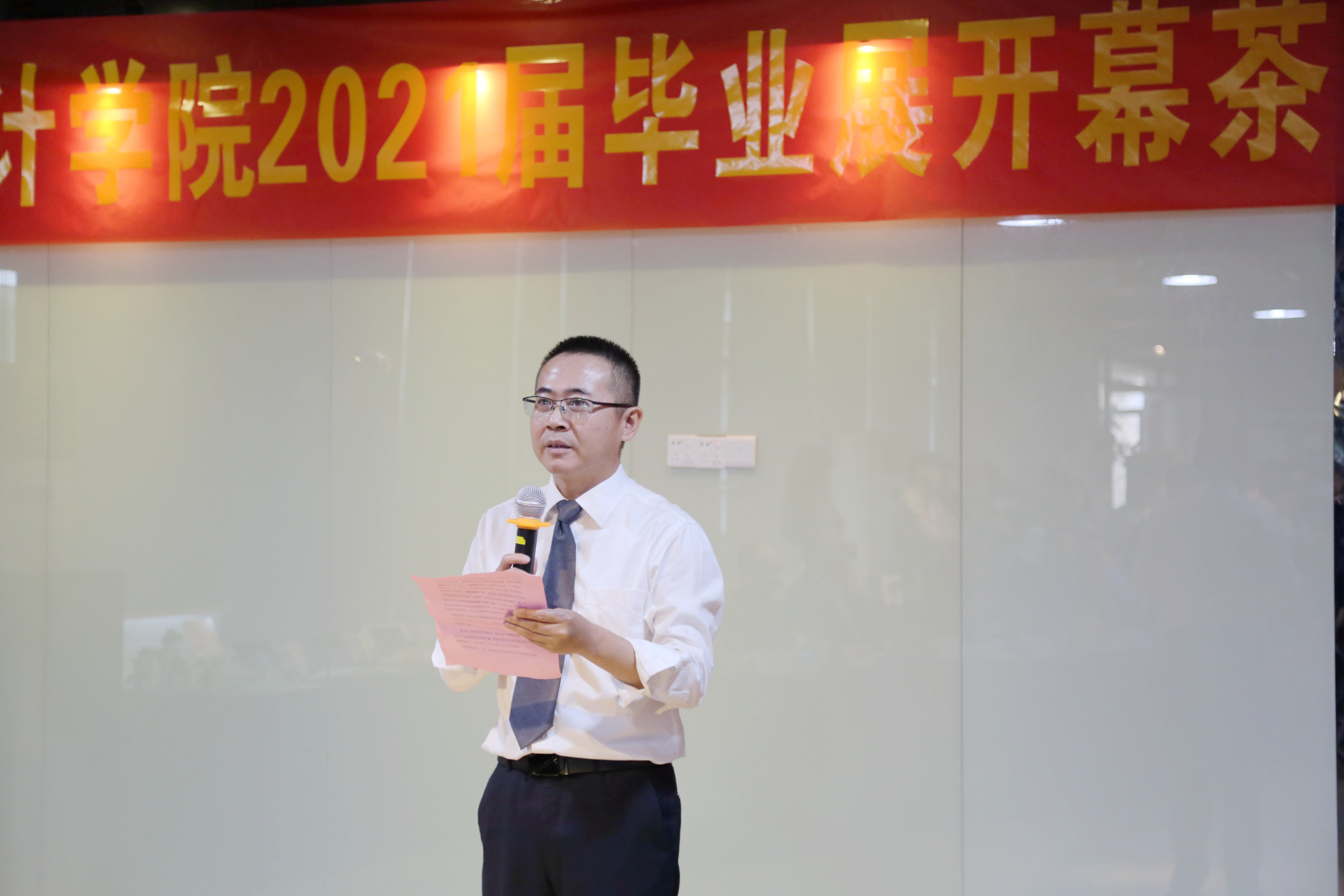 创意设计学院王锦锋院长向到来的领导嘉宾介绍了作品展的筹备工作。毕业设计展对设计学科来说,是教学环节的一个重要组成部分。2021届毕业设计展较之往年有了很大不同,随着工业设计学士学位授予权通过评估,创意设计学院首次迎来了三个专业毕设作品同台亮相的历史时刻,全体毕业生和37位毕设导师经过近5个月的努力,共呈现作品231份。