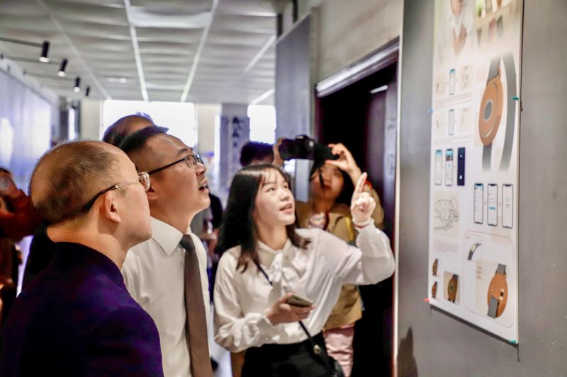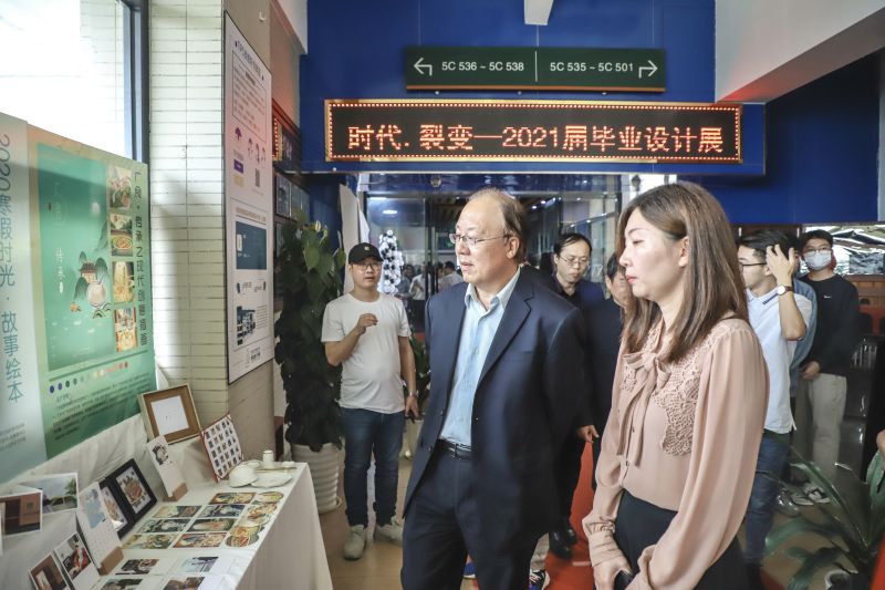 随后,领导嘉宾一同参观了毕业设计展。展览主题为“时代·裂变”,意在让处在这个不停变革之中的新一代大学生,用包含创意和艺术感的作品迎接时代的挑战,将新的思维和观点融入商业或公益设计,展示出设计专业大学生对时代变革的最强回响。
