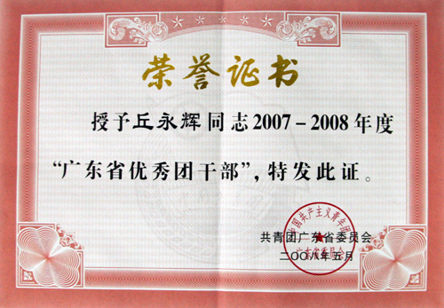 近日,院学生处副处长、团委书记丘永辉老师被评为2007——2008年度广东省优秀团干部,发展联络中心龙凤兰老师被评为东莞市优秀青年。