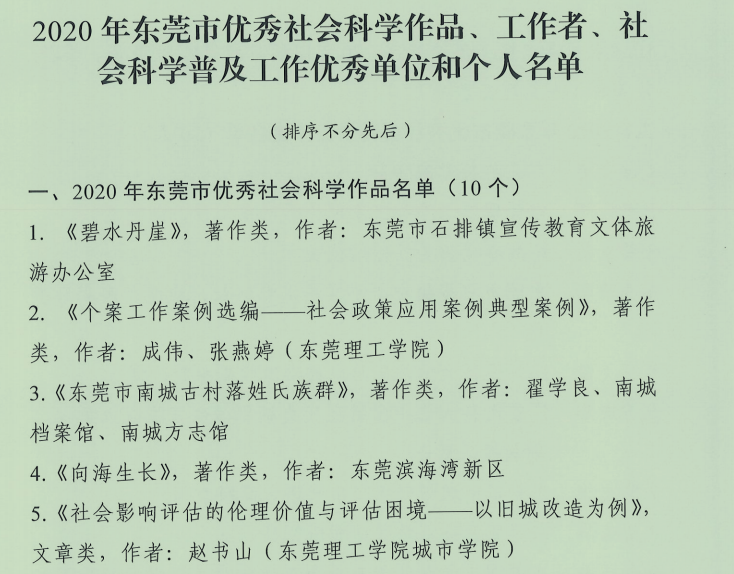 据了解,东莞市优秀社会科学作品由东莞市社会科学联合会组织,每年评审一次。评奖着眼于进一步繁荣发展哲学社会科学,推动东莞市哲学社会科学事业的发展,解决东莞市率先实现现代化进程中出现的理论和实际问题,促进全面深化改革、加快转型发展,为奋力推动“湾区都市、品质东莞”建设迈上新台阶贡献社科力量。