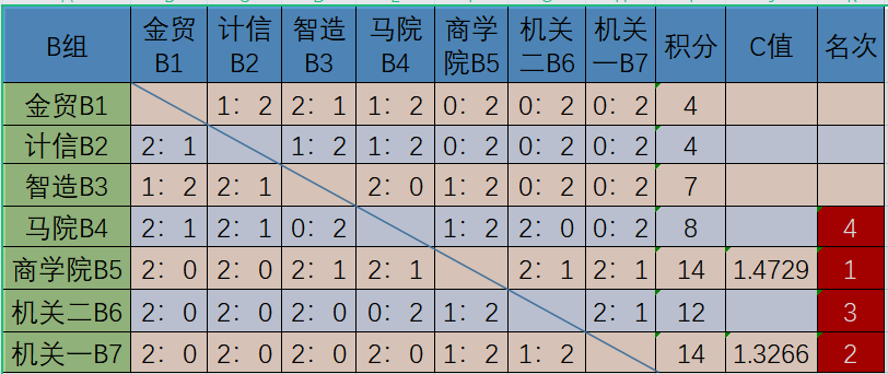 在B组,则是商学院和机关一则在7战中共积14分,商学院以不败一场的战绩位居第一。机关一7战中4场2:0直落,另外两场也仅以1:2惜败,积14分,位居小组第二。机关二和马院则以小组第三、第四名的成绩出线。