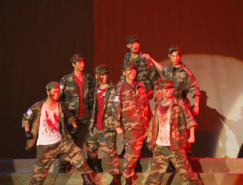 据文学与艺术系马新川教授介绍,这部舞台剧是由一个美国反战作家创作,剧中不但表现出强烈的反战情绪,而且体现出男子汉的阳刚之气,极具震撼力,演员们对剧情的把握和表演极富张力。