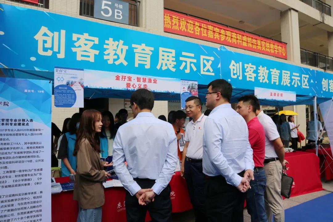 领导嘉宾们还参观了学校的创业成果展示区。据最新数据统计,该基地现有在孵团队数为13个,年总营收126.4万,总利润63.2万。展区中,东莞市人力资源和社会保障局工作人员现场为有意愿大学生进行创业政策咨询。大学生参与了创业沙龙和创业项目路演暨“青企杯”种子计划大赛等活动。