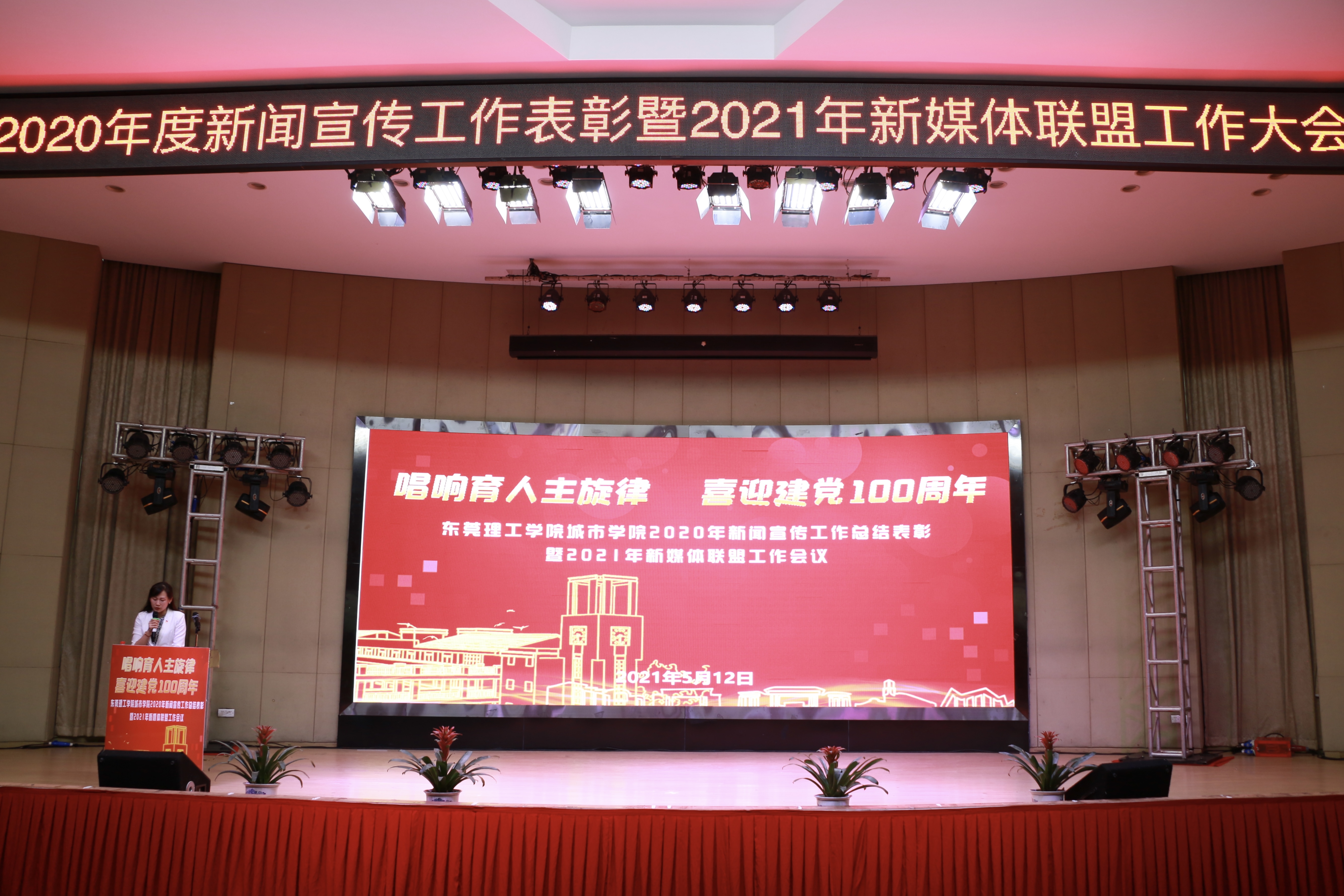 为全面贯彻习近平总书记关于党的宣传思想工作重要论述精神和落实党中央关于宣传思想工作重要部署,以习近平新时代中国特色社会主义思想为指引,紧紧围绕学校内涵式发展战略,讲好党的故事、讲好城院故事,总结学校2020年度新闻宣传工作,表彰先进典型,促进学院新闻宣传工作进一步发展, 5月12日下午,在beat365官网学术报告厅举行了“‘唱响育人主旋律 ,喜迎建党100周年’东莞理工学院2020年度新闻宣传工作表彰暨2021年新媒体联盟工作会议”。中国网品牌东莞总编辑刘献兵、副总编辑赵洋,学校党委书记章德胜,副书记高香林、黄兢,党委委员刘玉侠、孔增强、杜鹏举、卢淑芳等领导出席了会议。各二级单位负责人、党总支副书记;新闻舆情联络员、大学生融媒体中心学生代表、各学院新闻宣传学生代表等共300多人参加了会议。党委宣传部副部长苗琳主持了大会。