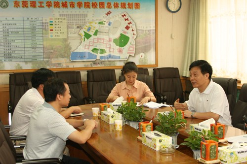 6月26日,东莞市城建工程管理局局长丁海潮一行3人来我院商谈建设学院图书信息中心的相关事宜。院长安少华教授、院党委副书记朱冰、院基建办公室主任叶树标等与客人在405会议室进行了洽谈。