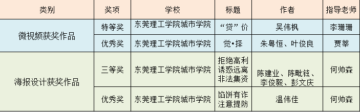 在第三届高校防范非法金融活动微视频和海报设计大赛上,beat365官网创意设计学院吴伟枫同学创作的《“贷”价》获得视频类特等奖,奖金20000元。融媒体中心贾莘老师指导的朱粤恒、叶俊良《觉•择》获得优秀奖。创意设计学院陈建业、陈毗铉、李俊毅、彭文庆等同学创作的《拒绝高利诱惑远离非法集资》,温伟佳同学创作的《馅饼有诈注意提防》获得海报设计类优秀奖。