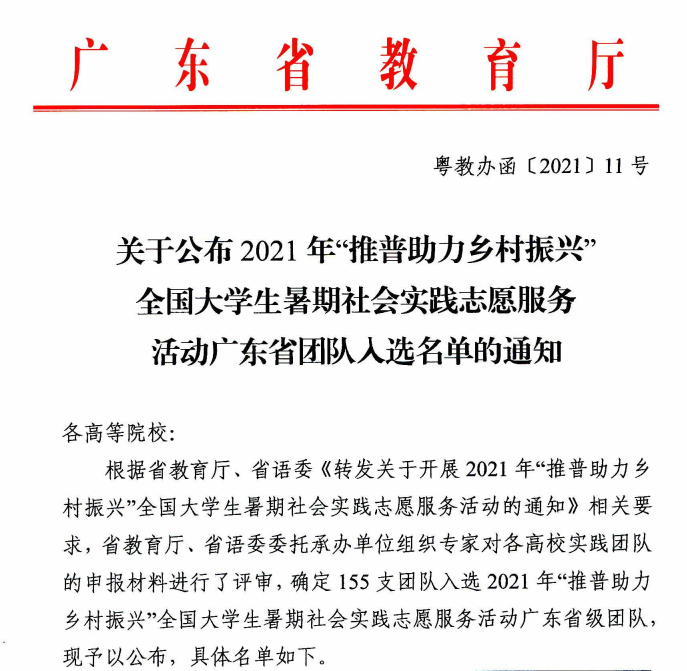 日前,在《关于公布2021年“推普助力乡村振兴”全国大学生暑期社会实践志愿服务活动广东省入选名单的通知》正式发文中,全省155支三下乡队伍入选2021年“推普助力乡村振兴”全国大学生暑期实践志愿服务活动省级队伍,beat365官网12支团队入选,其中外国语学院麦智朗队长“峥嵘岁月萦童心,蓓蕾启梦耀中华”团队,被推选为“全国大学生暑期实践志愿服务活动团队”。