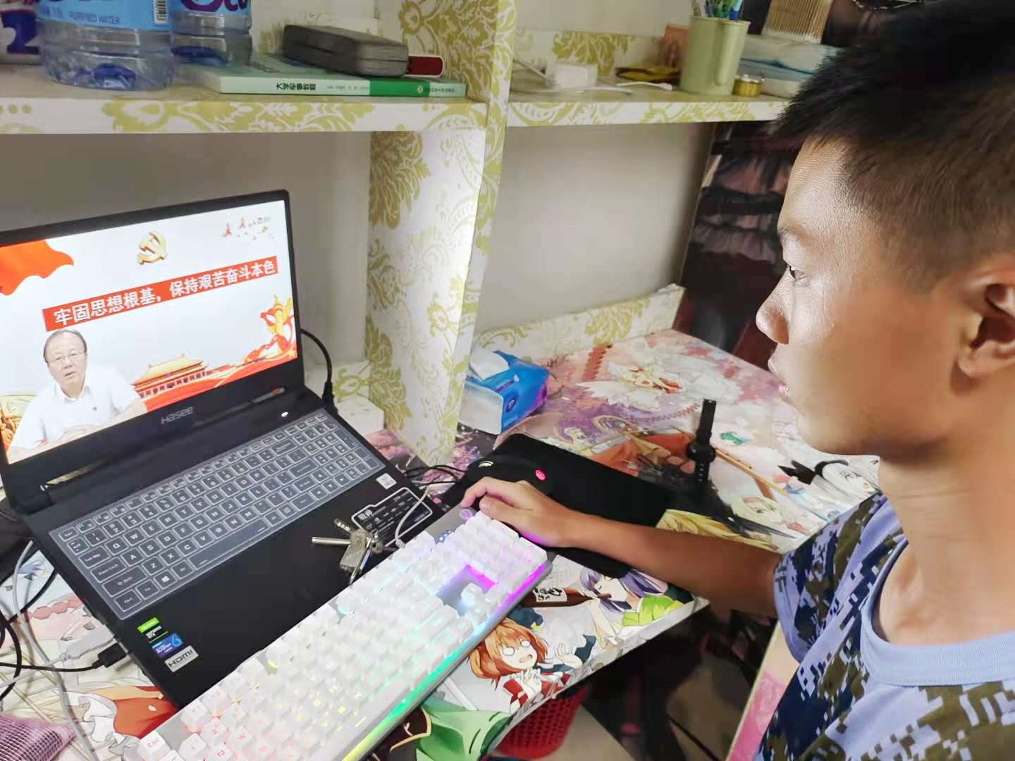 9月5日晚,按照学校军训的学习安排。学校党委书记章德胜给2021级新生作了《学百年党史 弘扬伟大抗疫精神 担当青年使命》主题报告。学校宣传部与学生处进行录制并上传到学校易班平台,2000多名新生在易班平台观看了书记报告。