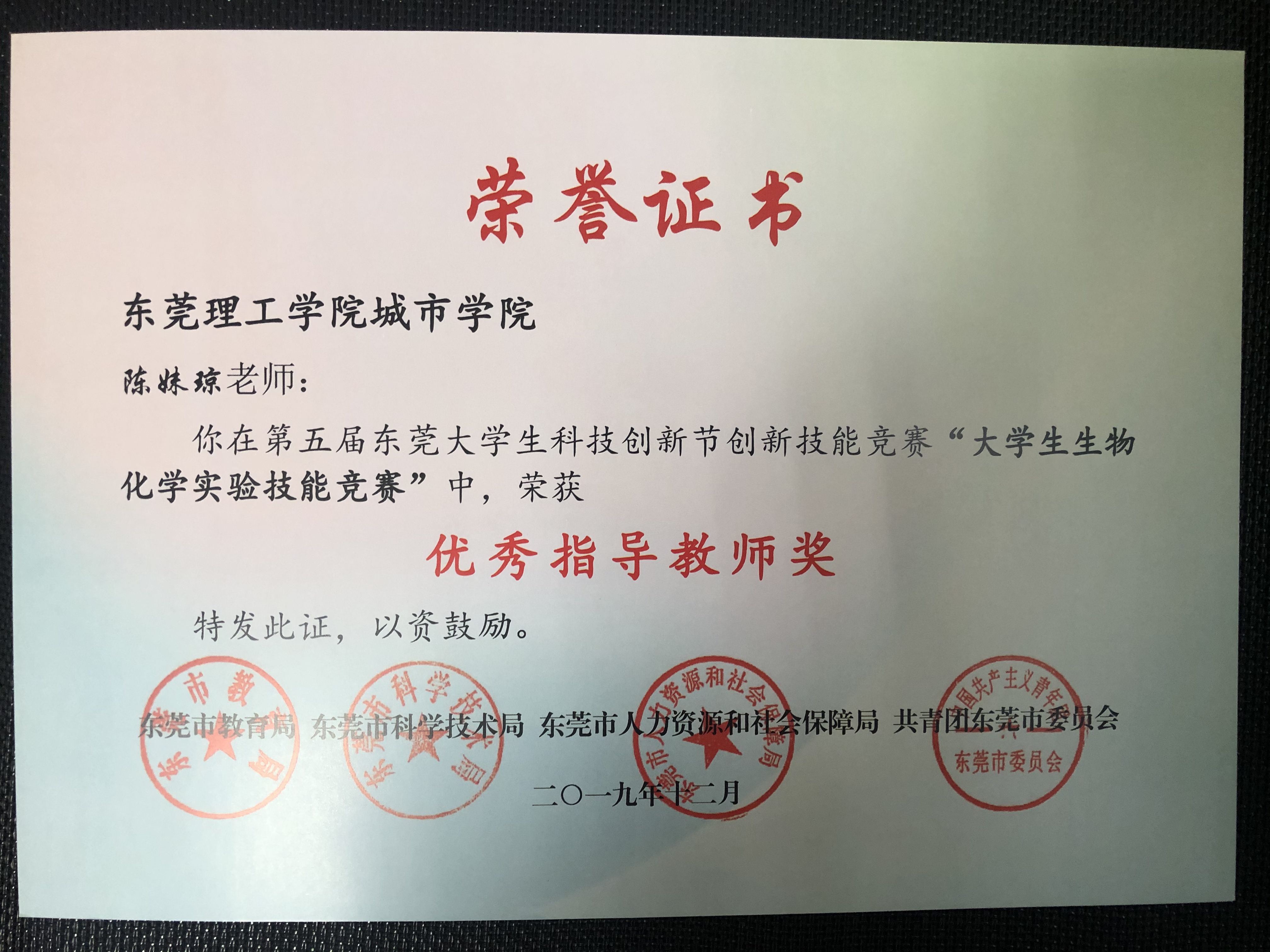 陈妹琼老师在beat365英国官方网站工作13年,多次获得“教书育人先进个人”“优秀共产党员”“优秀班主任”等荣誉称号;多次获得校、学院讲课比赛二等奖、三等奖,指导学生先后获得广东省大学生生物化学实验技能大赛一等奖、 “挑战杯”广东大学生课外学术科技作品竞赛二等奖、三等奖,连续几年在东莞市生物化学实验技能竞赛上获二等奖,获学校第五届“大创杯”创客梦想秀一等奖,她也多次被授予“优秀指导老师”。