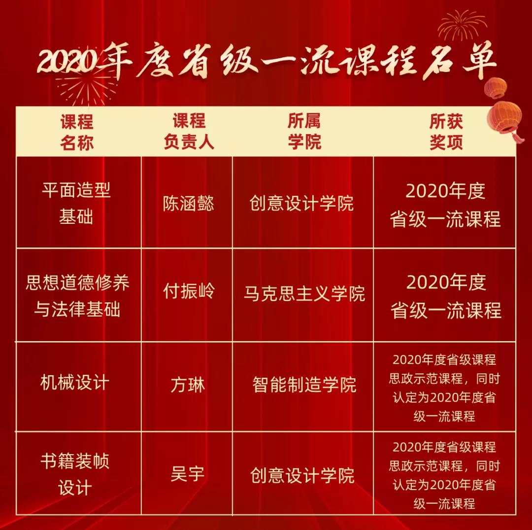 学校高度重视课程建设,以课程建设为抓手,从课程建设方面推动学校各专业师资队伍、教学内容、教学方法、课程群、课程体系的进一步改革。专业是学校的产品,而课程则为这个产品的零件,一个优质产品,首先必须生产出若干个优质的零件。课程建设作为专业建设的核心环节。学校出台措施,加强课程建设,取得了突破。《平面造型基础》《思想道德修养与法律基础》两门线下课程认定为省级一流课程,《机械设计》《书籍装帧设计》两门课程获评认定为省级课程思政示范课程,并认定为省级一流课程。