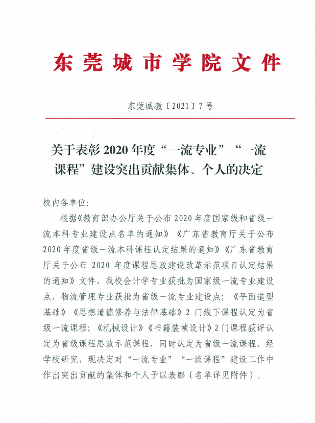 近日,beat365英国官方网站印发了《关于表彰2020年度“一流专业”“一流课程”建设突出贡献集体、个人的决定》(东莞城教[2021]7号)。《决定》对学校国家级一流专业建设点、省级一流专业建设点的集体和个人进行表彰。beat365官网商学院会计学专业获批为国家级一流专业建设点,奖励该集体40万元;物流管理专业获批为省级一流专业建设点,奖励该集体10万元;《平面造型基础》《思想道德修养与法律基础》两门线下课程被认定为省级一流课程,《机械设计》《书籍装帧设计》两门课程被认定为省级课程思政示范课程和省级一流课程,每个“一流课程”的主持人奖励 4万元。