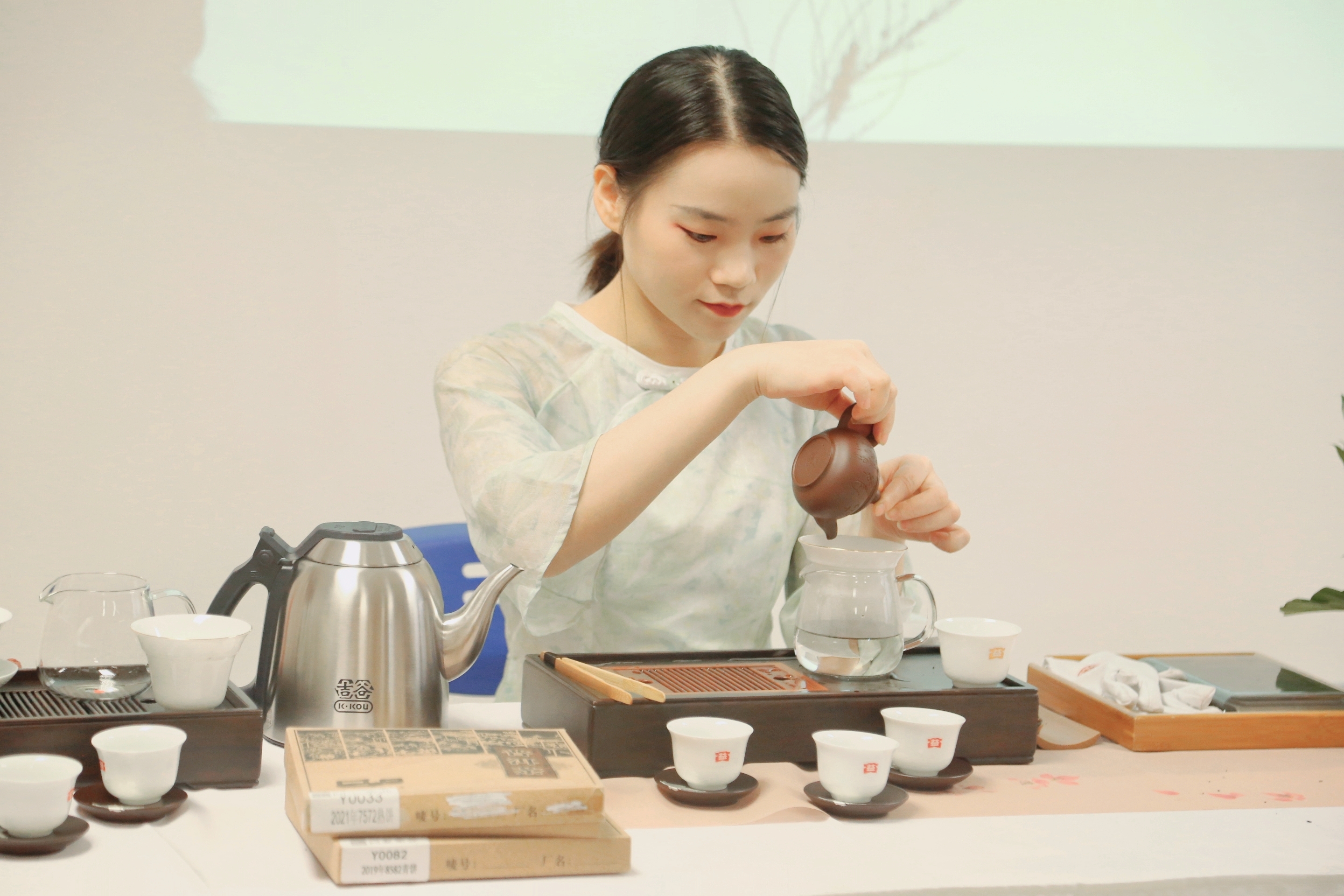 随后梁玉婷老师还进行了茶艺赏析。对茶具作了展示与介绍,茶艺师演示泡茶的流程、行茶的正确姿势和注水方式。茶不仅是生活中的饮品,也是社交的重要方式,蕴含着茶桌礼仪,在礼仪上,倒茶需遵循茶倒七分满,喝茶应遵循伸掌礼与叩手礼。