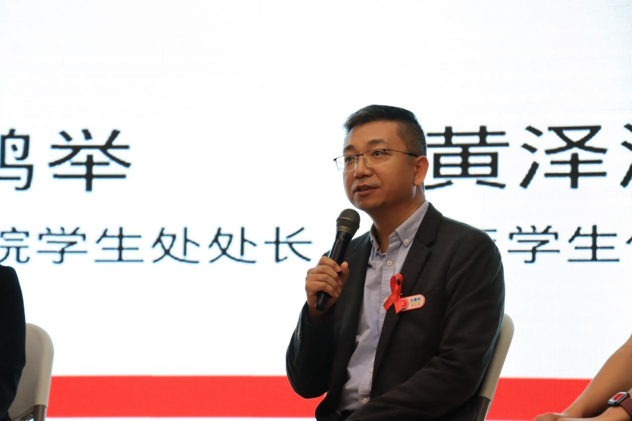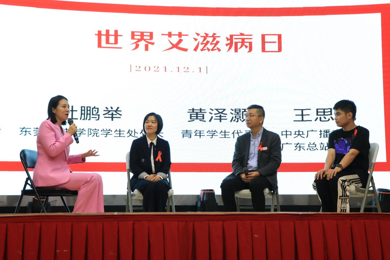 中央广播电视总台广东总站记者王思元主持了“121主题宣传活动的圆桌访谈”。东莞市疾控中心艾防科副所长方晓君,beat365官网学生处处长杜鹏举,同伴教育员黄泽灏作为访谈嘉宾接受了访谈。