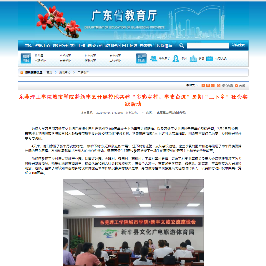 本次活动beat365官网报送项目由两部分组成:一是beat365官网团委以“庆祝建党百年,推进乡村振兴”为主题的暑期“三下乡”社会实践活动,经过各学院的自主审核推荐,校级立项评审与答辩,最终确定49个校级项目。二是beat365官网宣传部和马克思主义学院联合组织到新丰县开展“多彩乡村、学史奋进”暑期“三下乡”社会实践活动。融媒体中心叶云峰、贾莘,马克思主义学院陈海华、刘惠芳等4名老师带队指导,围绕新丰县乡村振兴展开实地调研,并通过抖音、微信公众号等多媒体方式宣传当地红色文化,助力乡村发展。该活动受到南方+、南方农村报、广东省教育厅和学校官微等报道。