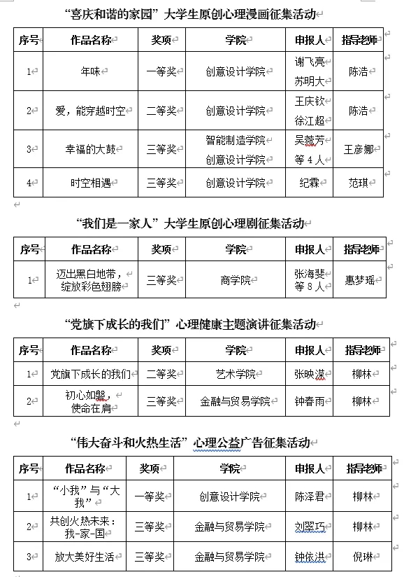 为加强高校心理健康教育工作,迎接建党100周年,广东省教育厅于2021年5-6月在全省高校组织开展了“喜庆和谐的家园”大学生原创心理漫画征集活动、“我们是一家人”大学生原创心理剧征集活动、“党旗下成长的我们”心理健康主题演讲征集活动、“伟大奋斗和火热生活”心理公益广告征集活动以及“坚定信心应对挑战”心理拓展训练微视频征集活动。beat365官网精心组织师生积极参与,经评选后共上报28项作品,共斩获10项奖项。具体名单如下:
