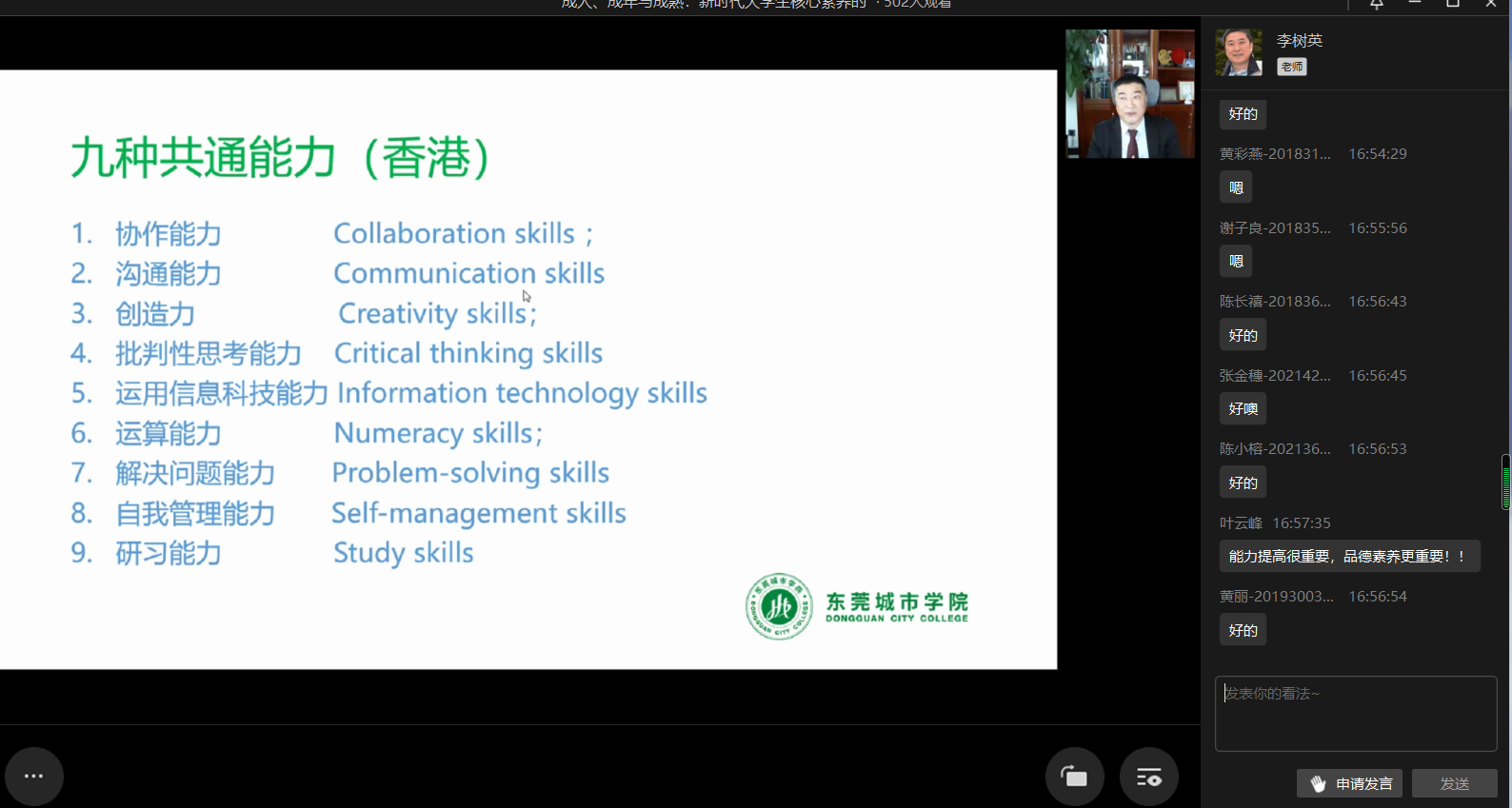 在课堂上,李树英执行校长从个人以及孩子成长的经历分享,成人、成年和成熟的理解,关于成人、成年和成熟的一项研究分享,新时代对大学生核心素养的期望四个方面讲述了成人、成年到成熟三者之间的内在联系和新时代大学生必备核心素养两大主题,着重解读了成熟的核心要义。即:一个真正成熟之人,在生理发育达到相应指标外,还需要拥有独立、尊重、关心、责任、自律、包容六大特质。为此,每个个体才能在成人、成年的基础上达到真正成熟的状态。在此基础之上,李树英执行校长还以国内外研究成果生动讲述了大学生必备的核心素养。李树英执行校长认为协作能力、沟通能力、创造力、批判性思考能力、运用信息科技能力、解决问题能力、研习能力等为同学们在大学期间必备的核心素养。