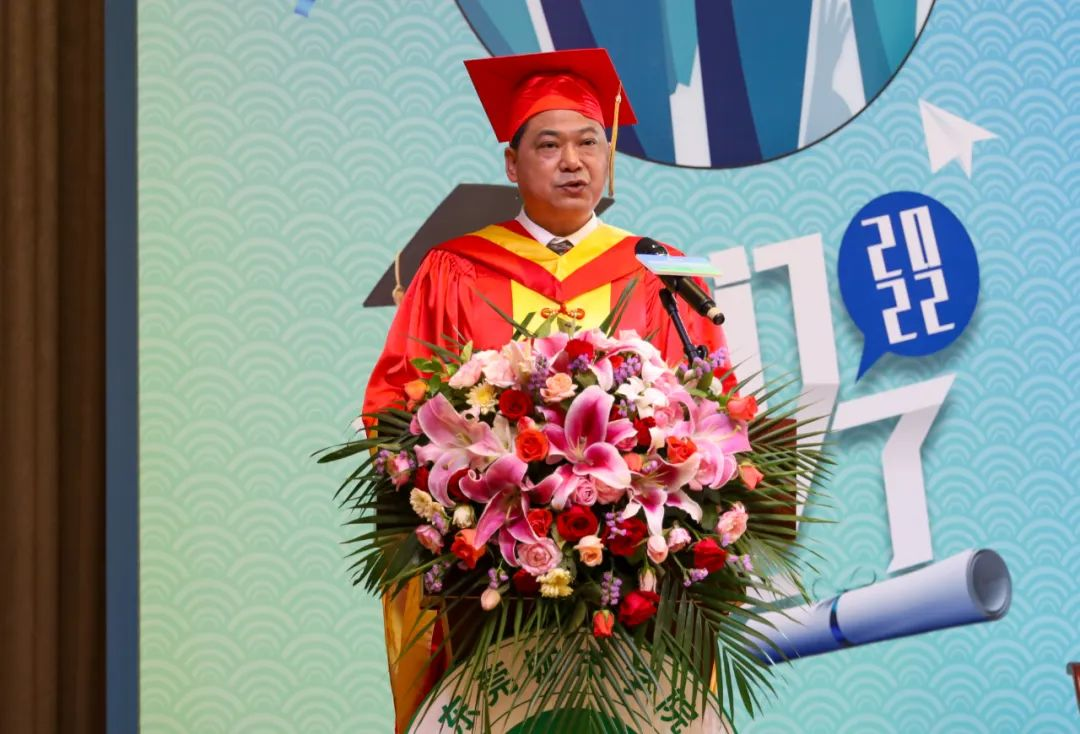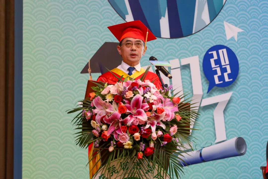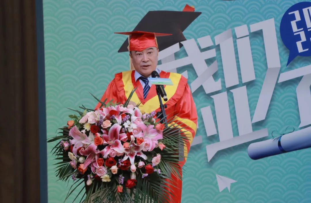 执行校长李树英发表致辞,他向毕业生表示衷心的祝贺!他谈到由于疫情原因,学校精心准备的毕业典礼,因要配合疫情防控要求下而不断压缩规模,所有人都为之深感遗憾。他指出新冠疫情急剧冲击并重塑着当今世界,人类进入一个易变性、不确定性、复杂性和模糊性的社会。在世界不确定性面前,要如何把握确定?李树英分享了几点感悟,一是面对不确定的事件,责任与担当是最大的确定;二是面对未知的未来,身向所往是最大的确定;三是面对错综复杂的世界,将终身学习作为毕生的信条是最大的确定。
