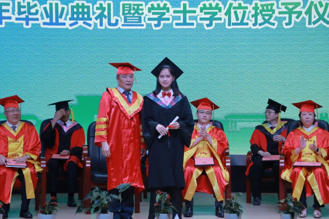 第二项议程为学士学位授予仪式。毕业生代表一一上台,学位评定委员会主任委员李树英教授为毕业生扶正流苏。
