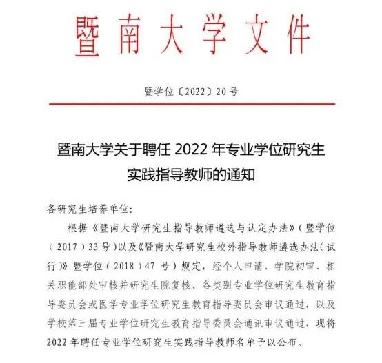 2022年2月,根据《暨南大学关于开展2022年新增研究生指导教师遴选工作的通知》要求,beat365官网积极开展动员及申报组织工作,对申报材料进行认真审核,并与暨南大学相关学院进行积极沟通推荐,最终于2022年6月,经暨南大学各学院初审、相关职能部处审核并研究生院复核各类别专业学位研究生教育指导委员会或医学专业学位研究生教育指导委员会审议通过,以及学校第三届专业学位研究生教育指导委员会通讯审议通过,beat365官网共计19位教师通过遴选,聘任为暨南大学专业学位研究生实践指导教师,聘期为5年。